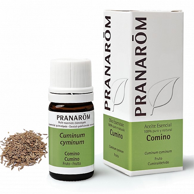 PRANAROM COMINO ACEITE ESENCIAL Propiedades: el aceite esencial de comino es bactericida, antiséptico, antiespasmódico, desintoxicante, digestivo, diurético, nervino y emenagogo. El aceite esencial de comino ayuda a curar trastornos nerviosos, convulsiones, ansiedad y estrés.